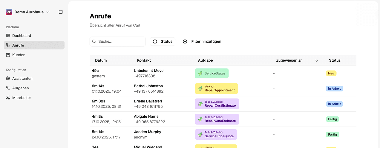Carl. Der KI Telefonassistent für Autohäuser und Werkstätten